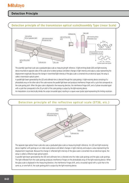DetectionPrincipleDetectionprincipleofthetransmissionopticalscale(AssemblyTypeLinearScale)Scalegratings(20µmgraduationpitch)Light-receivingdevice(Photodiodearray)Light-emittingdiode(LED)Light-receivingdevice(Photodiodearray)20µmCollimatorlensGlassscaleLight-emittingdiode(LED)CollimatorlensGlassscale2-phasesinusoidalsignalsInterpolationcircuitResolution2-phasesquarewavesignalsTheassemblytypelinearscaleusesagraduatedglassscaleasmeasuringlengthreference.Alight-emittingdiode(LED)andlight-receivingdevicemountedonoppositesidesofthescaleservetodetectproduceanddetectchangesinlightintensityandoutputavaluerepresentingthedisplacementmagnitude.Becausethechangeintransmittedlightintensityoftheglassscaleisconvertedintoanelectricalsignal,thesetupiscalledatransmissionopticalsystem.AparallellightbeamgeneratedbytheLEDandcollimatorlensisdirectedthroughthescalegratings.Alight-receivingdeviceconsistingofaphotodiodearrayontheothersideofthescalereceivestheparallellightbeamandproducesinterferencefringeswithacyclethatcorrespondstothescalegratingpitch.Whentheglassscaleisdisplacedinthemeasuringdirection,theinterferencefringesshift,anda2-phasesinusoidalsignalwithacyclethatcorrespondstothe20µmpitchofthescalegratingsisoutputbythelight-receivingdevice.Aninterpolationcircuitelectricallydividestheoutputsinusoidalsignal,resultinginasquarewave(pulse)signalrepresentingthelimitingresolution.Detectionprincipleofthereflectiveopticalscale(ST36,etc.)Light-emittingdiode(LED)Light-receivingdevice(Photodiodearray)MainscaleCollimatorlensIndexscaleTheseparatetypeopticallinearscalealsousesagraduatedglassscaleasmeasuringlengthreference.AnLEDandlight-receivingdevicetogetherwithgratingsonanindexscaleproduceanddetectchangesinlightintensityandoutputavaluerepresentingthedisplacementmagnitude.Becausethechangeinreflectedlightintensityoftheglassscaleisconvertedintoanelectricalsignal,thesetupiscalledareflectivetypeopticalsystem.AparallellightbeamgeneratedbytheLEDandcollimatorlensisdirectedontotheindexscalegratingsandtheglassscalegratings.Thelightreflectedfromthescalegratingsproducesinterferencefringesonthephotodiodearrayofthelight-receivingdevice.Whentheglassscaleisdisplacedinthemeasuringdirection,theinterferencefringesshift,andasinusoidalsignalwithacyclethatisthesameas,orone-halfof,thescalegratingpitchisoutputbythelight-receivingdevice.8-63